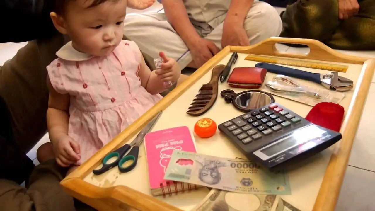 Trẻ sẽ tự lựa chọn một món đồ. Món đồ được bé cầm lấy thường được ông bà, cha mẹ xem như dấu hiệu dự đoán nghề nghiệp hoặc tính cách tương lai của con.